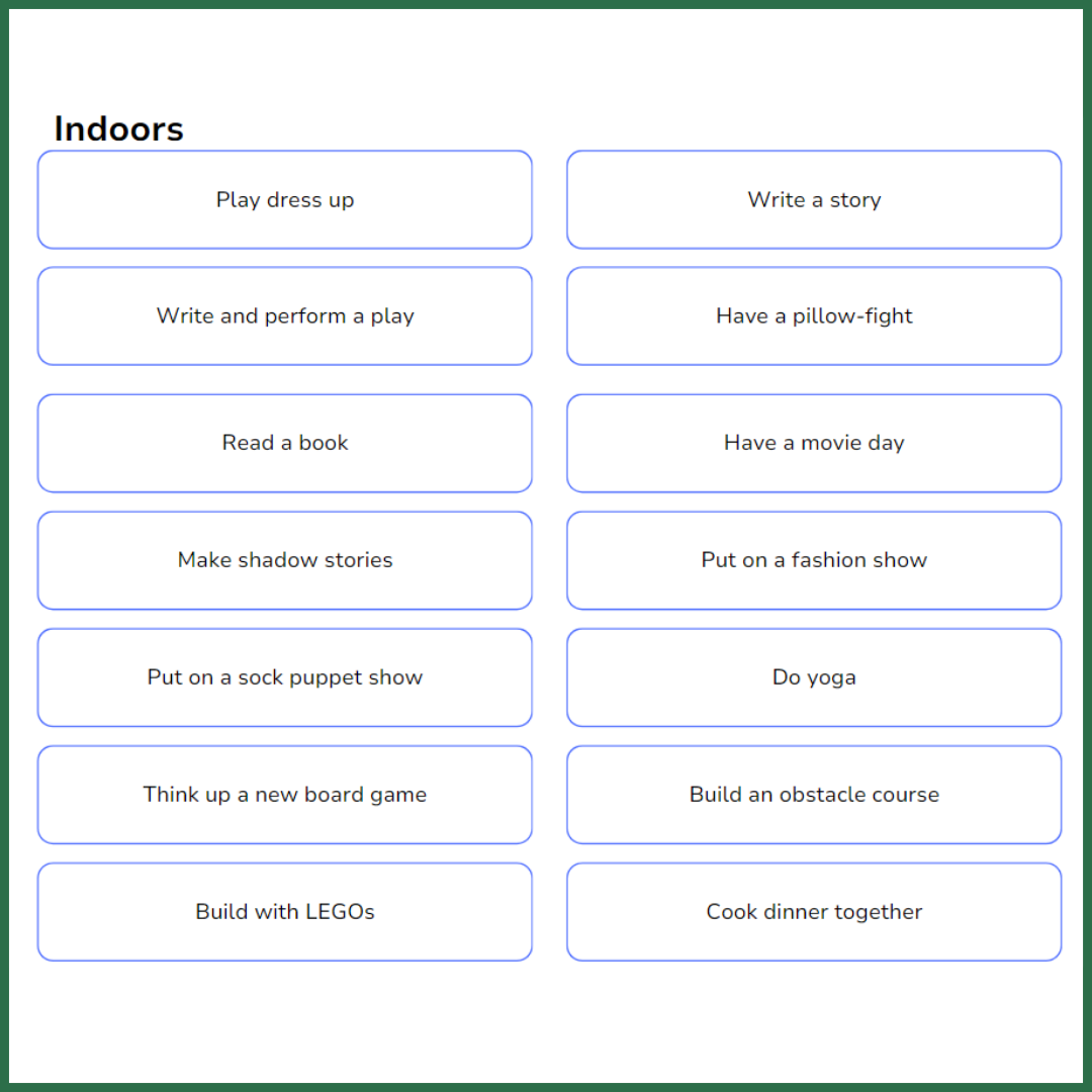 Unleash your creativity with our 'Create' ideas, get active 'Outdoors', or be entertained 'Indoors' on those rainy days!